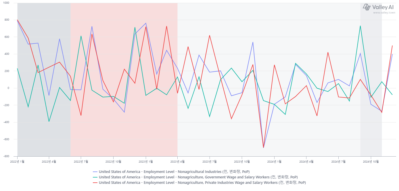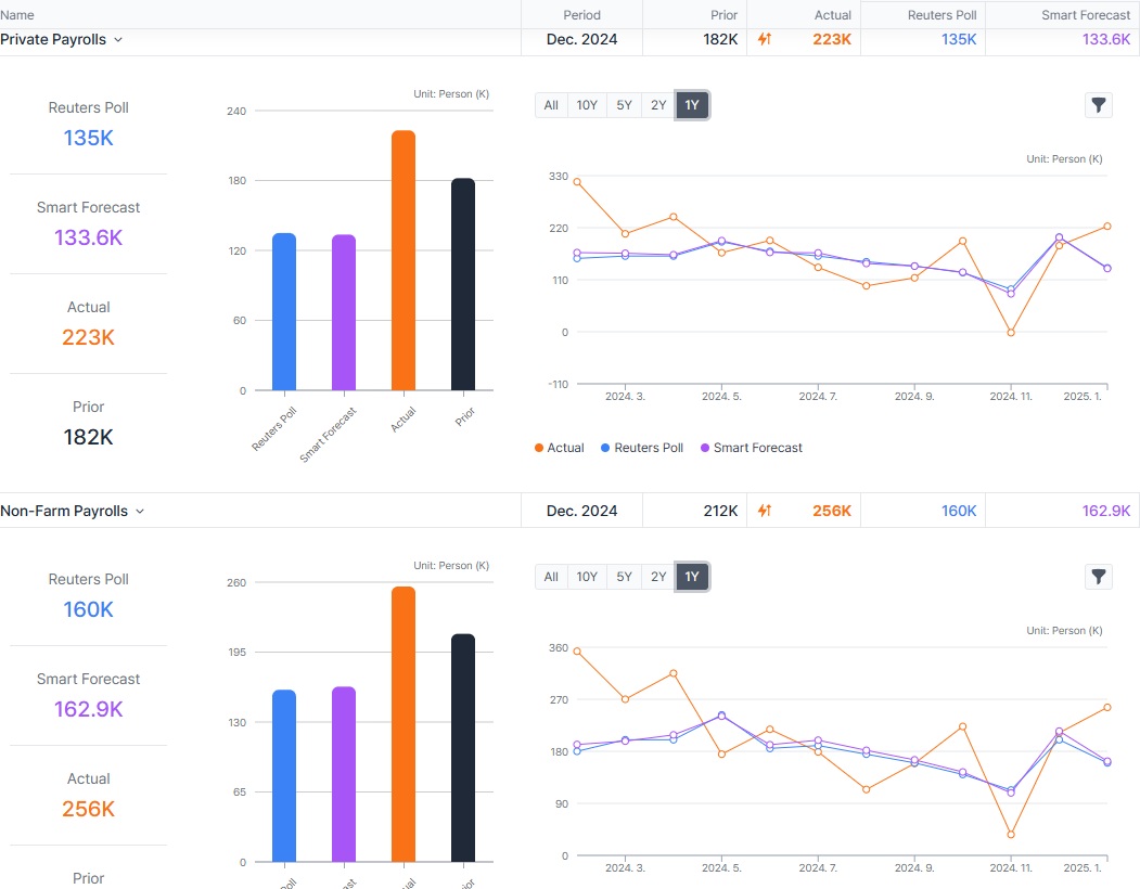 어제 밤(2025-01-10, 22:30 한국시간 기준) 발표한 두가지 중요한 고용지표에서 Surprise가 나왔다.