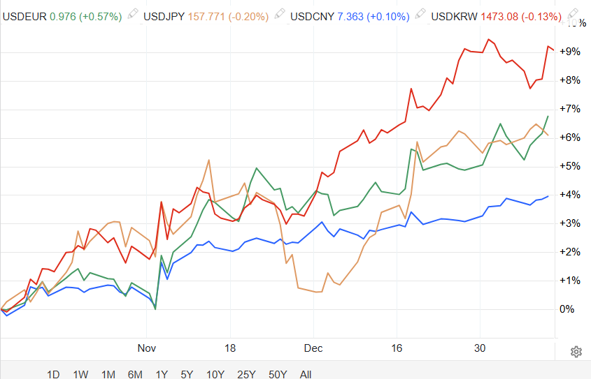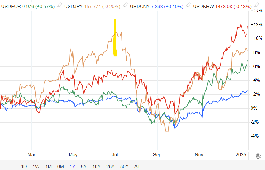 위의 한국 당국의 환율 안정화 정책에 반하는 환율 급등은 별로 이상할 것 없는 달러 강세 때문이다.