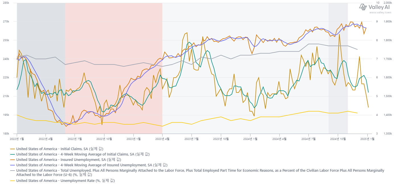 실업수당청구건수는 20년 이후 비교할 때 녹색에서 옅은 분홍색에서 다시 ...