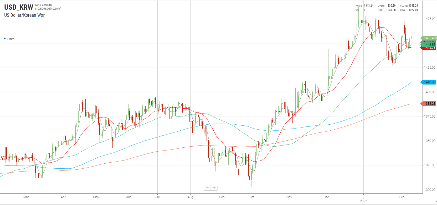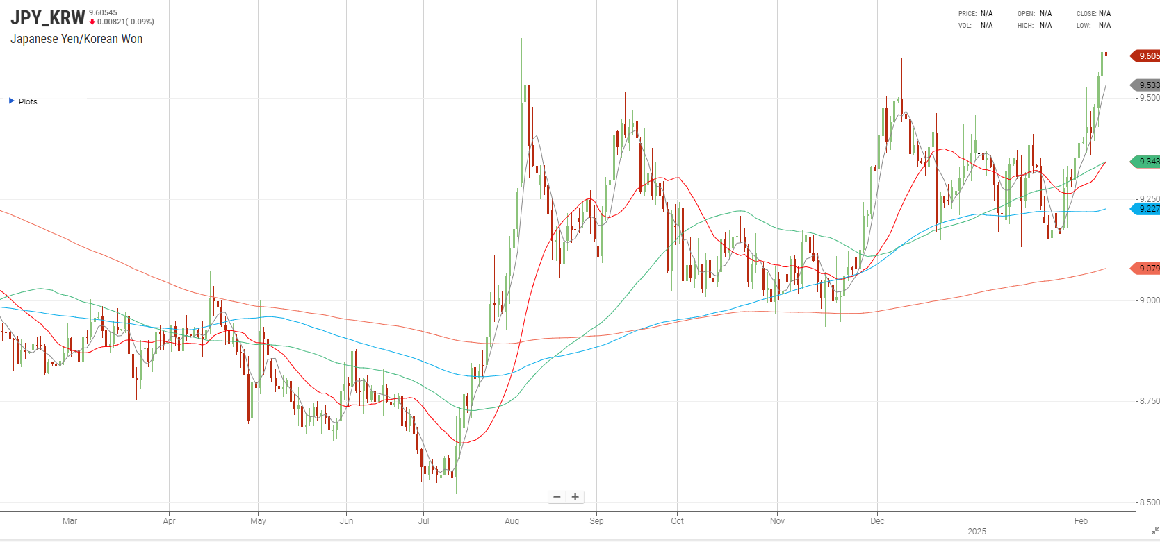 1월 초 고점을 형성하고 뚜렷한 하락세(엔 강세)이다.