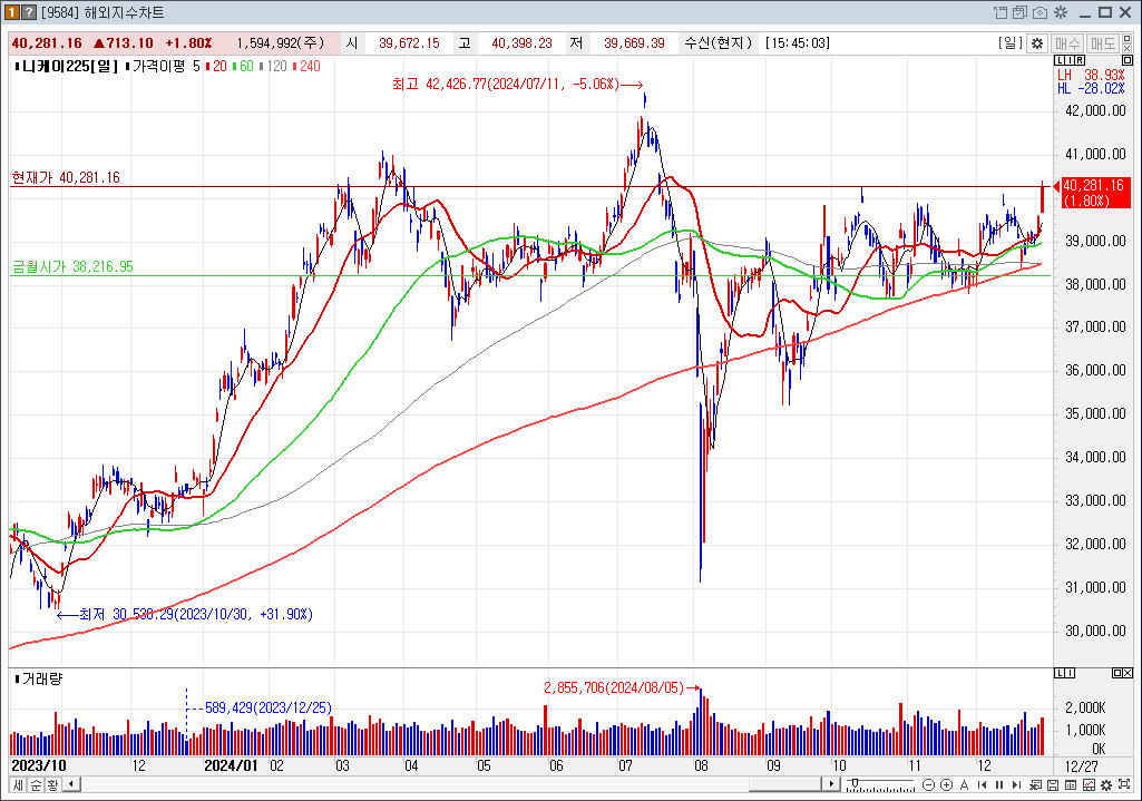 1월 초가 고점이긴 한데 일본보다 훨씬 고점이고 하락이라기 보다 횡보하고 있다.