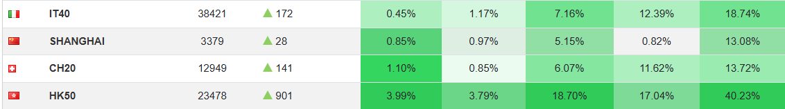 위 표는 21일 하루 세계 주요 증시 등락률 순서로 정렬한 것이다.