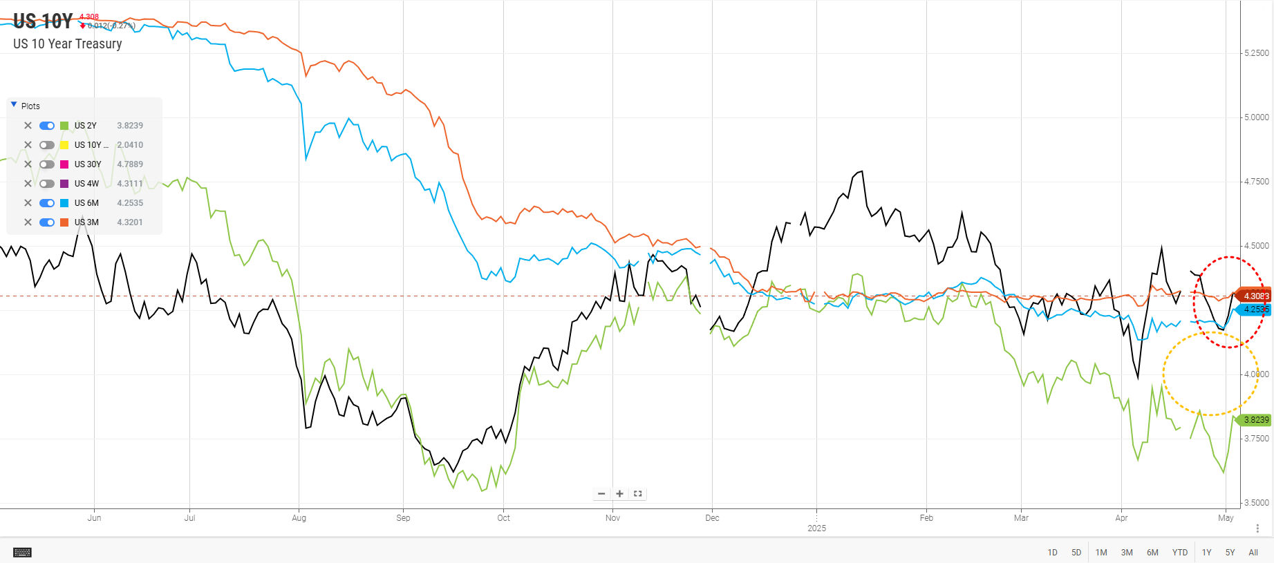 장기물과 단기물의 수렴(convergence)도 눈여겨봐야겠다.(아래 빨간색 원)