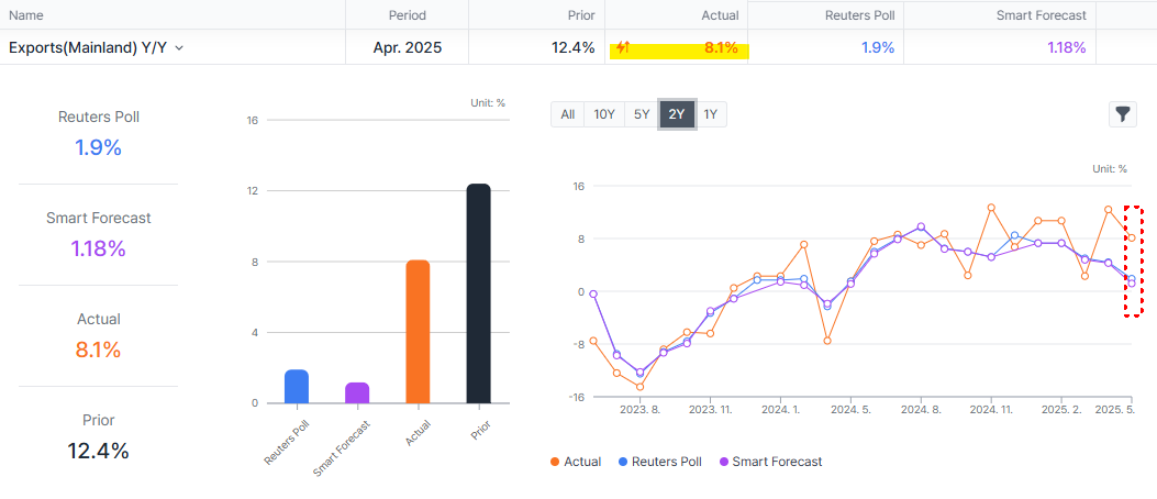 한편, 중국의 새로운 데이터에 따르면 관세의 초기 영향이 나타났다. 4월 대미 수출은 전년 동기 대비 20% 이상 감소한 반면, 동남아시아 수출은 급증했다.