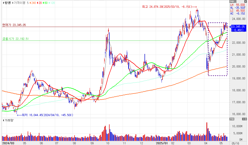 항셍지수는 지난 3월 고점을 아직 못 넘기고 주저하는 모양새이다.