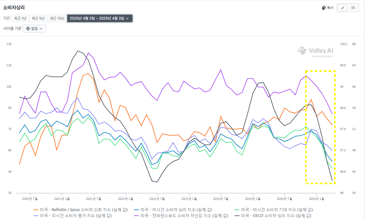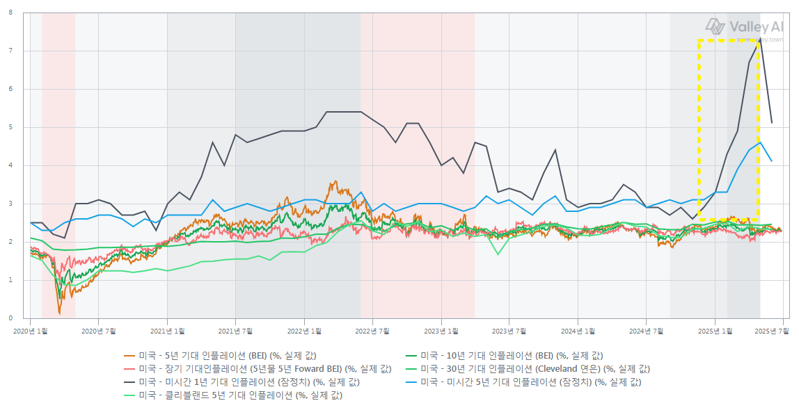 아래 표에서 보듯이, 트럼프가 재선된 직후부터 최근 관세폭탄으로부터 TACO 별명을 얻기 직전까지 미시건대학교에서 조사하는 기대인플레는 급등했다.