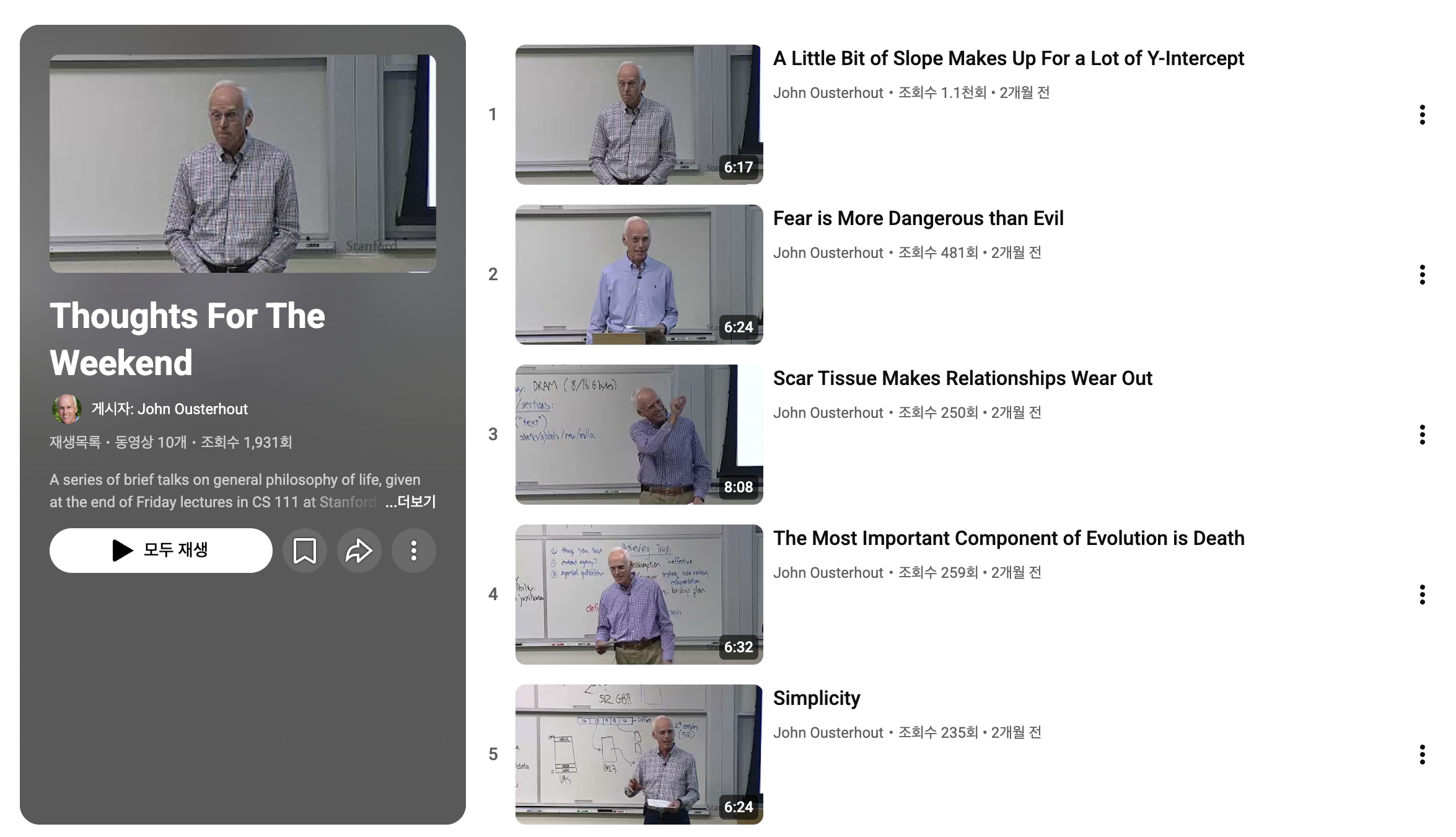 스탠퍼드 대학교 컴퓨터과학과 교수였던 존 아우스터하우트(John Ousterhout)는 운영체제 수업에서 매주 금요일 수업 마지막 5분에 "Thoughts for the Weekend"라는 짧은 인생 철학 강연을 했습니다.
