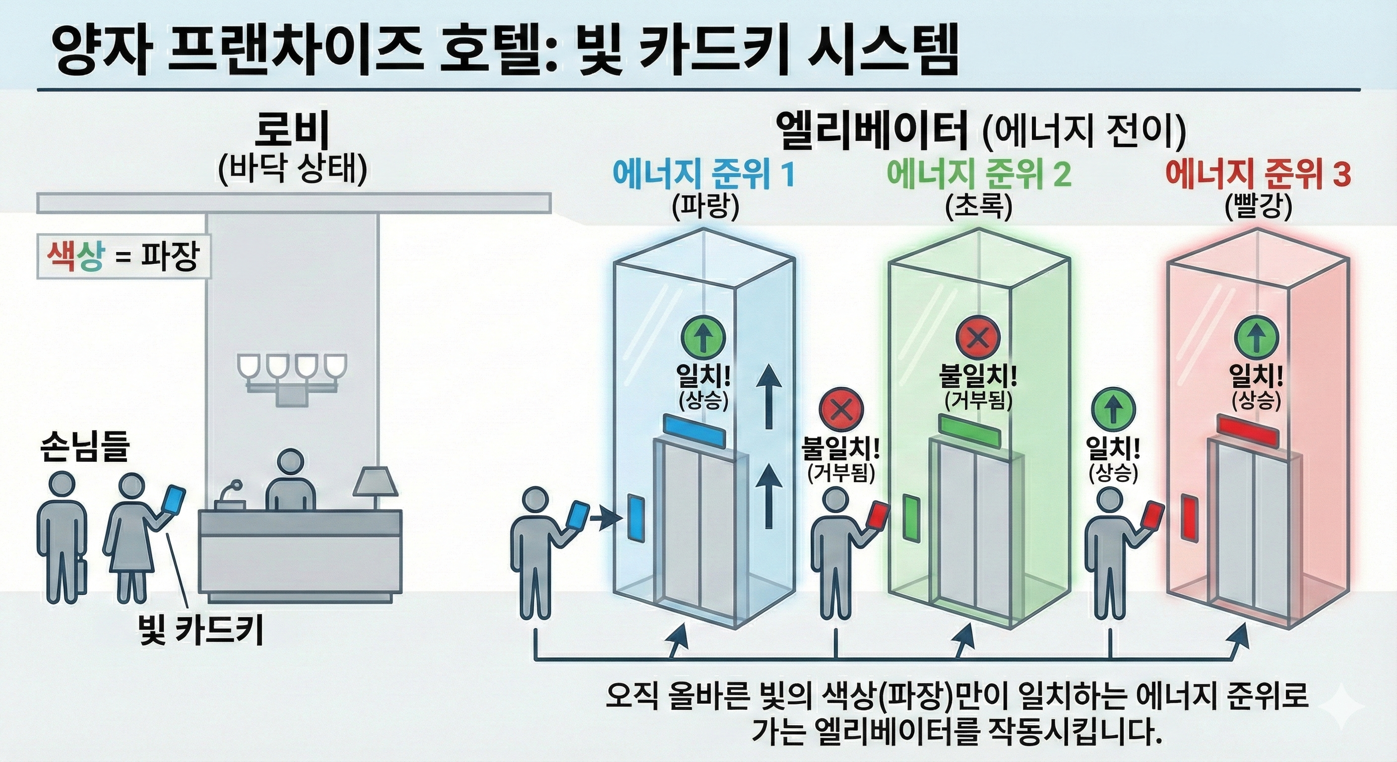 예를 들어, A라는 양자호텔에 파란색 빛 에너지에 해당하는 높이의 방이 있다고 가정해보겠습니다. 로비와 그 높이 차이에 해당하는 에너지의 빛 즉, 파란 색깔의 빛 카드가 손님에게 주면 엘리베이터는 작동해서 손님은 새로운 방으로 갈 수 있습니다.