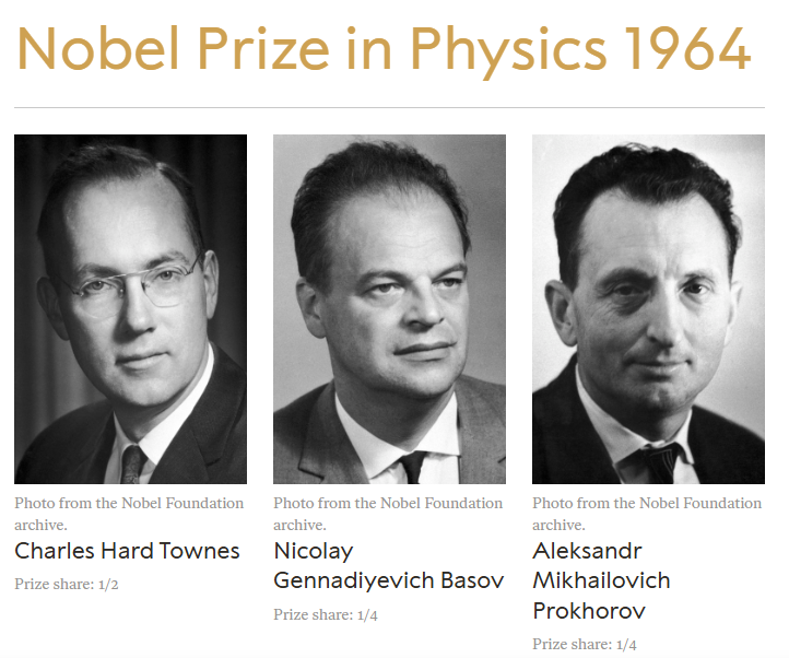 이 세 과학자는 "메이저-레이저 원리에 기반한 발진기 및 증폭기 구축으로 이어진 양자 전자 공학 분야의 기초 연구에 대한 공로"를 인정받아 노벨상을 받았습니다.