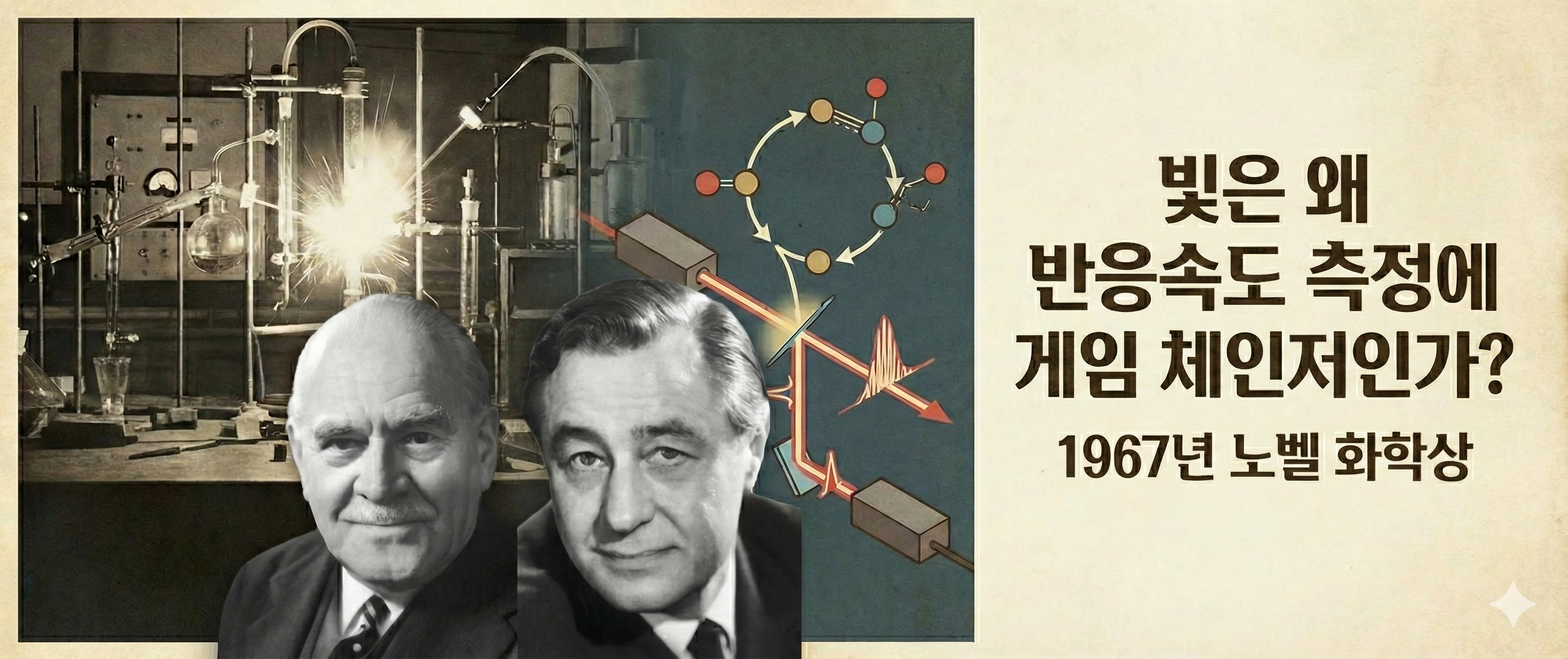 라는 문장으로 시작했습니다. 그리고 1967년 노벨 화학상, "매우 짧은 에너지 펄스를 가해 평형을 순간적으로 교란하고, 그 결과 나타나는 초고속 화학 반응을 연구한 공로"에 대해 총 5편에 걸쳐서 다뤘습니다.