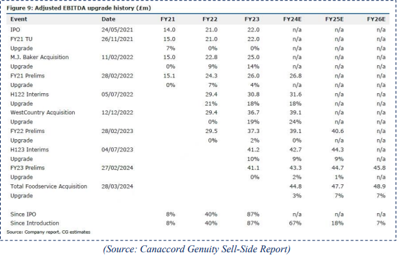 1. M&A 활동과 미래 성장을 지속적으로 과소평가하는 유일한 매도 측 애널리스트: Kitwave의 IPO 이후, 유일한 매도 측 애널리스트인 Canaccord Genuity는 회사의 미래 실적을 지속적으로 과소평가해 왔습니다. 아래는 2024년 3월 기준 Canaccord의 조정 EBITDA 상향 가이던스 내역입니다: