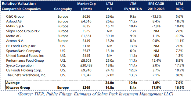 유럽과 미국에서 상장된 동종 식품 도매 기업들과 비교할 때, Kitwave는 훨씬 더 견고한 성장 프로필과 업계 최고의 투자 자본 수익률을 보유하고 있음에도 불구하고 P/E와 EV/EBITDA 기준 모두에서 상당한 할인된 가격에 거래되고 있습니다. Kitwave와 비슷한 밸류에이션으로 거래되고 있는 다른 기업들 중 유일하게 빈약하거나 마이너스 수익 성장을 기록했으며, 이와 유사하게 인상적인 성장 및/또는 질적 지표인 자본수익률을 보여준 기업들은 현재 Kitwave보다 훨씬 높은 밸류에이션 멀티플에서 거래되고 있습니다.