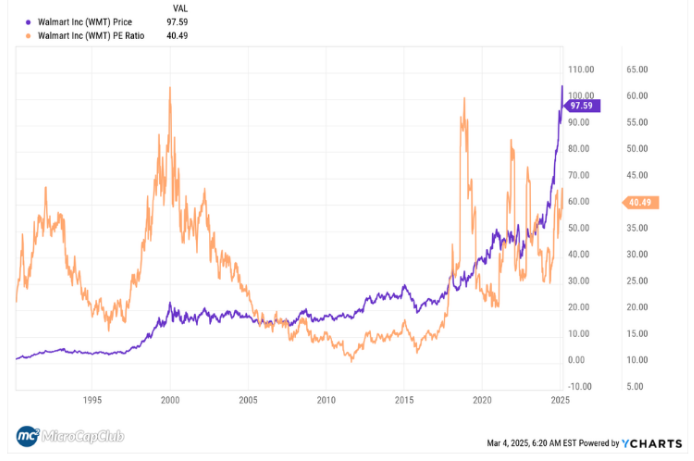 지난 40년 동안 WalMart는 10~60 PE 범위에서 거래되었습니다. 심층 가치 투자자와 성장 투자자를 끌어들였습니다. 수십 년에 걸친 멀티배거의 대부분은 밸류에이션 롤러코스터를 탔습니다.