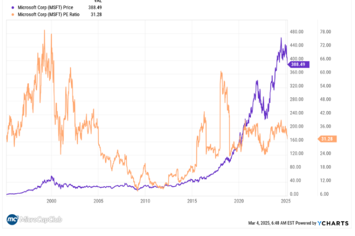 1999년에 Microsoft는 80의 주가수익비율(PE)로 거래되고 있었습니다. 높은 주가수익비율은 높은 기대치를 의미합니다. 성장 및 고성장 투자자들이 몰려들고 있었습니다.