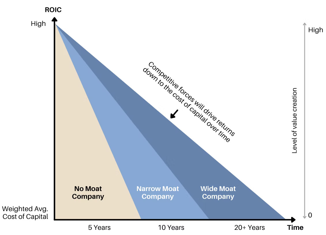 그리고 이는 투자자들에게 실질적인 결과를 가져옵니다. 투자 자본 수익률의 크기와 지속성이 궁극적으로 장기적인 주주 가치를 이끌기 때문입니다. 바로 이것이 해자가 보호해 주기로 되어 있던 것이었습니다. 해자는 기업들에게 시간을 벌어주었습니다. 높은 수익률로 재투자할 시간, 경쟁사에게 가격 경쟁력에서 밀리지 않고 규모를 확장할 시간, 그리고 다른 시장 참여자들이 따라잡는 동안 가격 결정력과 마진을 방어할 시간을 벌어주었습니다.