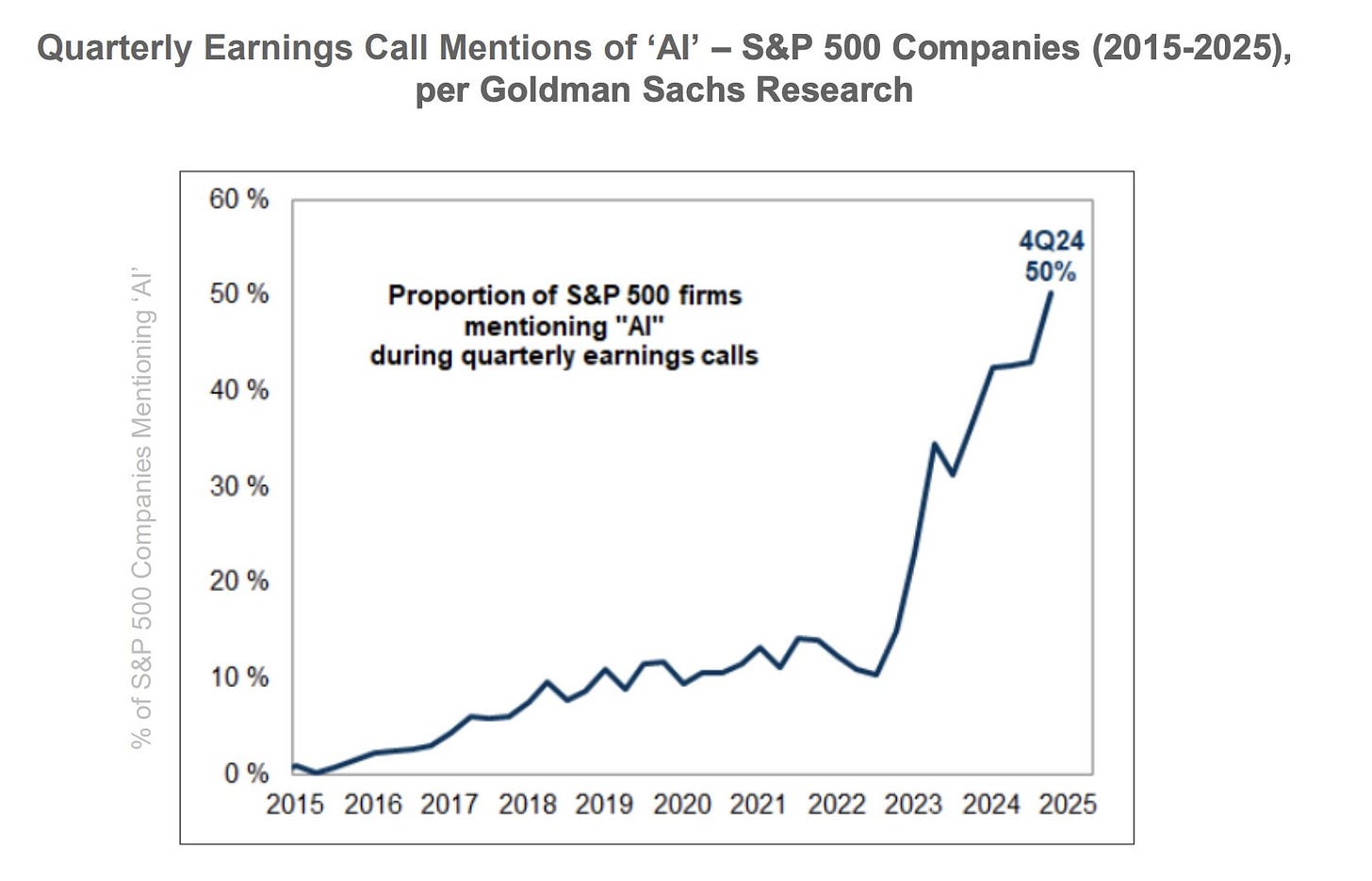 이와 동시에 AI는 기업 커뮤니케이션을 장악하고 있습니다. 위에서 보셨듯이, S&P 500 기업의 절반 이상이 이제 실적 발표에서 AI를 언급합니다. 이는 불과 2년 전만 해도 거의 존재하지 않았던 수치입니다. 기술, 헬스케어, 에너지에 이르기까지 모든 기업이 투자자들(어쩌면 자기 자신도)에게 AI 전략을 가지고 있다고 설득하려 애쓰고 있습니다.