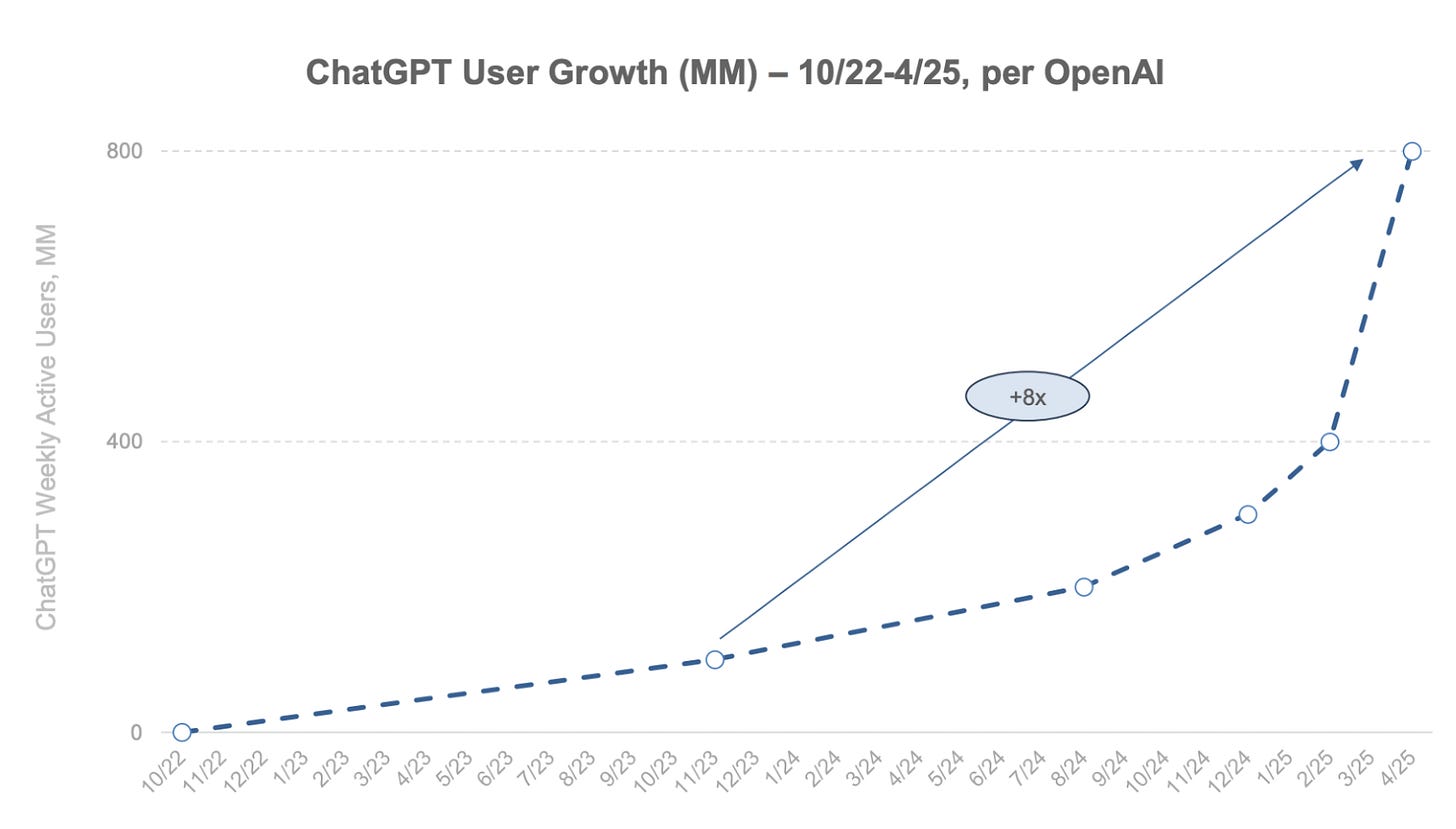 수치는 엄청납니다. ChatGPT의 사용자 기반은 출시 이후 8배 성장하여 현재 월 사용자 8억 명에 달합니다. 미국이 아닌 인도가 현재 가장 큰 사용자 기반을 가진 국가로, 전체의 14% 이상을 차지합니다. 최근 ChatGPT를 통한 일일 검색량(!)은 10억 건을 넘어섰으며, 이는 구글이 달성했던 속도보다 5배 이상 빠른 것입니다.
