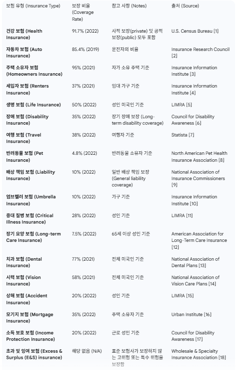 아래 표는 주요 보험 유형, 그 보장 범위 비율 및 기타 관련 참고 사항을 요약한 것입니다. 개인 보험부터 전문적인 보장까지 다양한 보험 환경을 보여줍니다.
