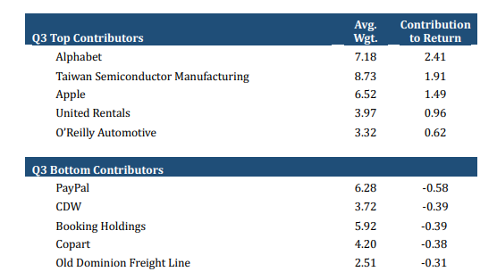 제3분기 최고 성과 기여 기업에는 Alphabet, Taiwan Semiconductor Manufacturing(TSMC), Apple, United Rentals, O'Reilly Automotive가 포함됩니다. 분기 최고 성과 저해 기업은 PayPal, CDW, Booking Holdings, Copart, Old Dominion Freight Line입니다.