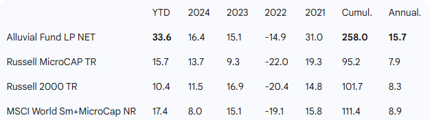 저는 앨루비얼 펀드가 3분기에 15.5%의 수익률을 기록했으며, 2025년 연초 대비 총 수익률이 33.6%로 모든 관련 벤치마크 지수를 크게 능가했다고 보고하게 되어 기쁩니다. 이는 펀드 설립 이래 9년 역사상 세 번째로 좋은 분기 실적입니다. 저는 올해나 내년의 남은 기간이 번창할 것이라고 확실하게 약속할 수는 없지만, 저의 능력 범위 내에서 모든 것을 다할 것입니다. 저는 매번 앨루비얼의 수치가 임의의 기간에 비해 특히 강하게 보일 때마다, 어려운 시기가 올 때 인내해 주시기를 요청드립니다(그리고 잠시 동안은 그런 시기가 오지 않을 수도 있기를 바랍니다!). 저는 앨루비얼이 2017년 펀드 설립 이후 좋든 나쁘든 다양한 시장 환경을 통해 신중하고 능숙한 경영을 입증해 왔다고 믿으며, 그 결과가 스스로 말해 준다고 생각합니다.