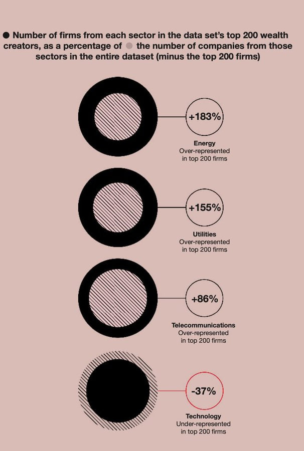 에너지 및 유틸리티와 같은 일부 산업은 최고 부 창출자에서 과대대표되는 반면, 기술 산업은 과소대표됩니다.