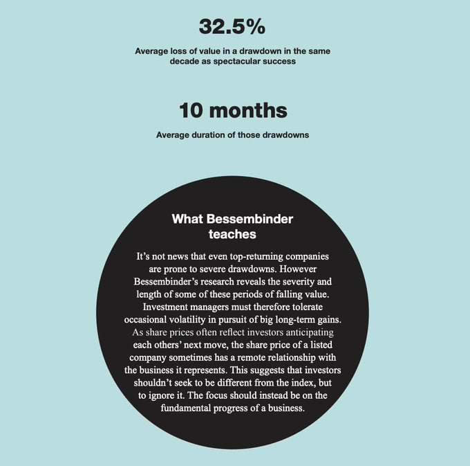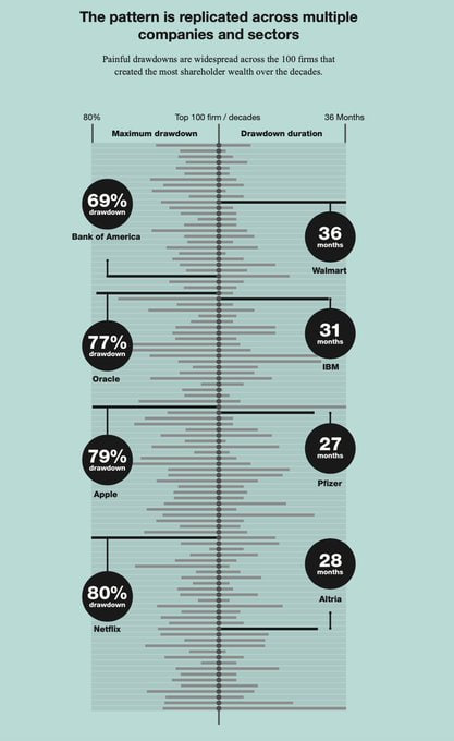 베셈빈더의 연구에 따르면, 최고 성과를 내는 기업들조차도 대규모 하락을 경험한다. 애플은 30년 동안 74%, 80%, 79%의 하락을 겪었으며, 이는 투자에서 장기적인 인내의 중요성을 보여준다.