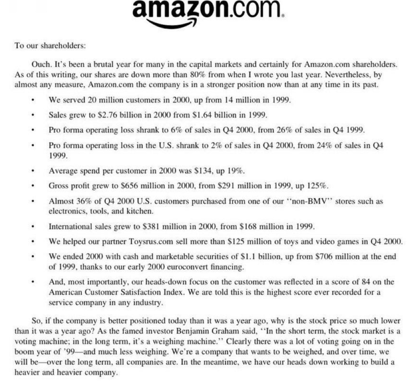 제프 베이조스가 닷컴 버블 붕괴 직후인 2000년에 작성한 주주 서한 역시 같은 맥락입니다. 그는 단기적으로 주식 시장은 '투표기'와 같지만, 장기적으로는 '계중기'라고 언급하며 본질적인 기업 가치의 중요성을 강조했습니다.