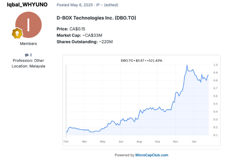 D-BOX Technologies Inc. (DBO.TO) - 2025년 5월 6일 회원 Iqbal_WHYUNO에 의해 주당 $0.15에 프로파일링되었으며, 현재 주당 $0.84입니다.