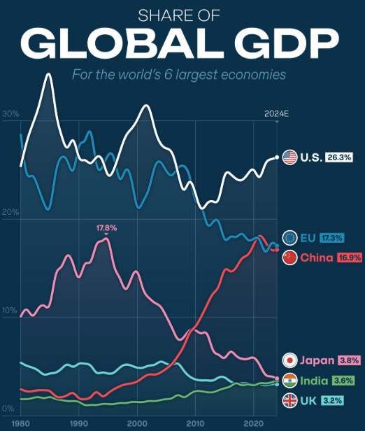 많은 이들이 법치주의, 민주주의, 기업가 정신, 강력한 기술력 및 군사력 등을 그 이유로 꼽습니다. 하지만 이러한 요소들은 위협받을 수 있으며, 잘못된 지도력으로 인해 실패할 수도 있습니다. 세계 GDP 점유율을 살펴보면 중국이 빠르게 추격하고 있는데, 이것이 결국 세계의 초강대국이 바뀔 것이라는 우려의 근거가 되어야 할까요?