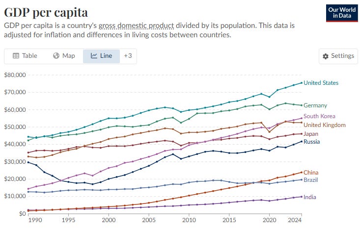1인당 기준으로도 미국은 역시 최정상에 있습니다. 실제로 지난 200년 넘는 기간 동안 미국의 GDP는 큰 이탈 없이 연평균 2%의 복리로 성장해 왔습니다.