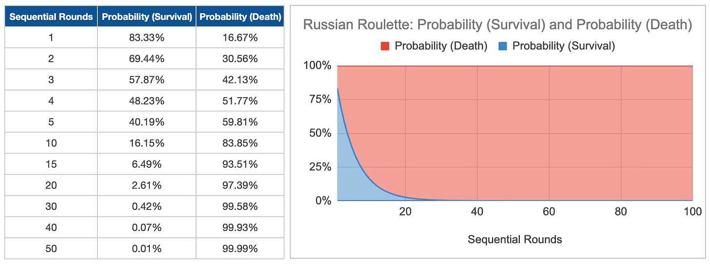 이제 한 사람이 100회 동안 연속해서 러시안 룰렛을 하는 상황을 가정해 봅시다. 이 경우 그 사람은 거의 확실하게(약 99.999999%) 사망합니다. 첫 번째 라운드에서 사망 확률은 16.7%이지만, 라운드가 진행될수록 확률은 급격히 상승합니다. 사망 확률은 5라운드 후 약 60%, 10라운드 후 84%, 20라운드 후 97%, 30라운드 후에는 99%까지 치솟습니다. 이것이 바로 시간 평균입니다.