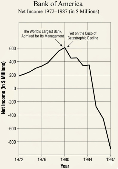 하지만 그들의 투지 넘치고 리스크에 민감했던 문화는 비대하고 관료적인 특권 의식으로 완전히 대체되었습니다. 그들은 자신들이 '위대한 뱅크 오브 아메리카'이기 때문에, 부실한 인수 심사 원칙에 따른 대가를 치르지 않고도 공격적으로 대출할 수 있다고 가정했습니다. 그 실체가 드러나는 과정은 격렬하고 빨랐습니다. 8년 만에 그들은 미국 은행 역사상 가장 처참한 손실 중 일부를 기록하며 글로벌 시장을 뒤흔들었습니다. 53년 만에 처음으로, 은행은 그들의 '신성한 배당금'을 삭감해야만 했습니다.