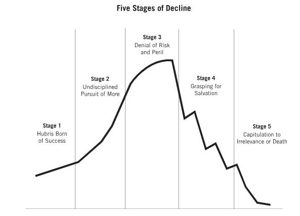 콜린스는 기업의 몰락이 5단계의 뚜렷한 과정을 거치는 질병이라는 사실을 발견했습니다.