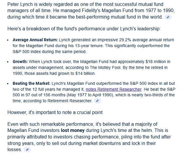 이처럼 놀라운 성과를 거두었음에도 불구하고, 린치가 펀드를 운용하던 시절 마젤란 펀드 투자자 대다수는 손실을 입었습니다. 투자자들은 수익률에만 쫓아 호황기에 펀드에 몰려들었다가, 시장이 침체기에 접어들자 매도해 버렸습니다.