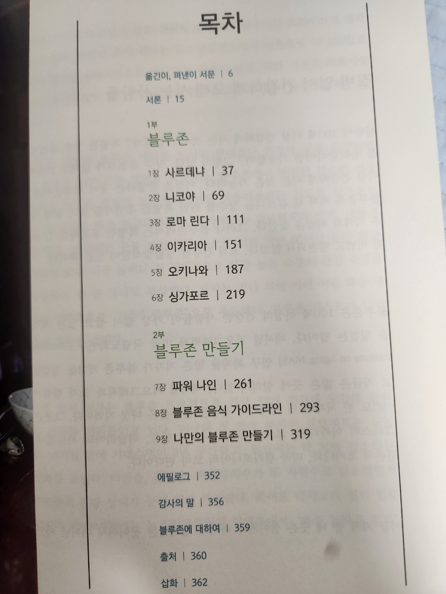 책의 목차는 다음과 같습니다. 블루존으로 선정된 도시의 사람들의 삶에 대해서 이야기하고, 어떻게 하면 나의 삶도 블루존으로 만들 수 있을까에 대해서 이야기합니다.