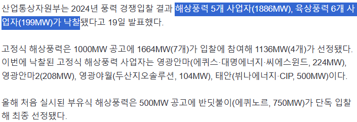 였고, 어제 2번에 해당하는 국내 해상풍력 경쟁입찰 결과가 나왔다.