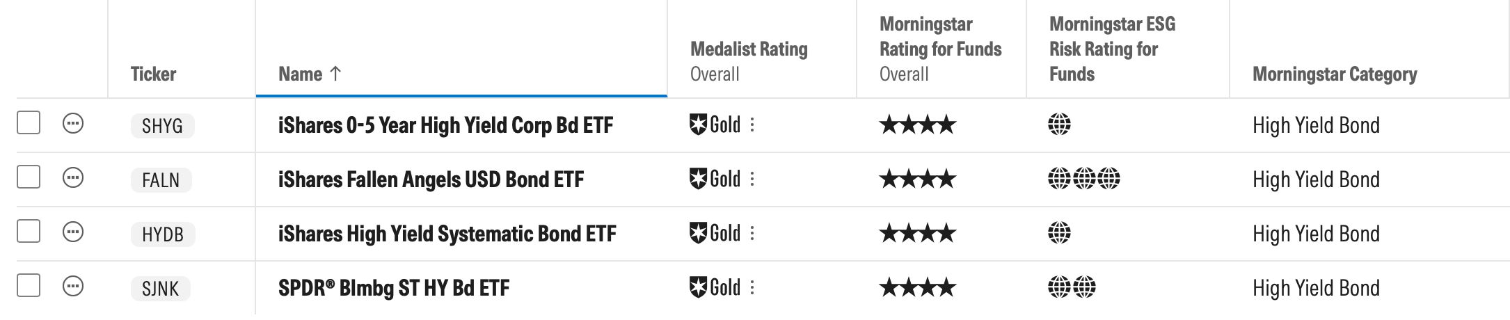 저는 일반 투자자가 쉽게 접근하는 방법인 ETF투자를 하고 있습니다. 아래는 제가 구독 중인 모닝스타의 정보를 활용해 스크리닝한 하이일드 채권 ETF 정보입니다.