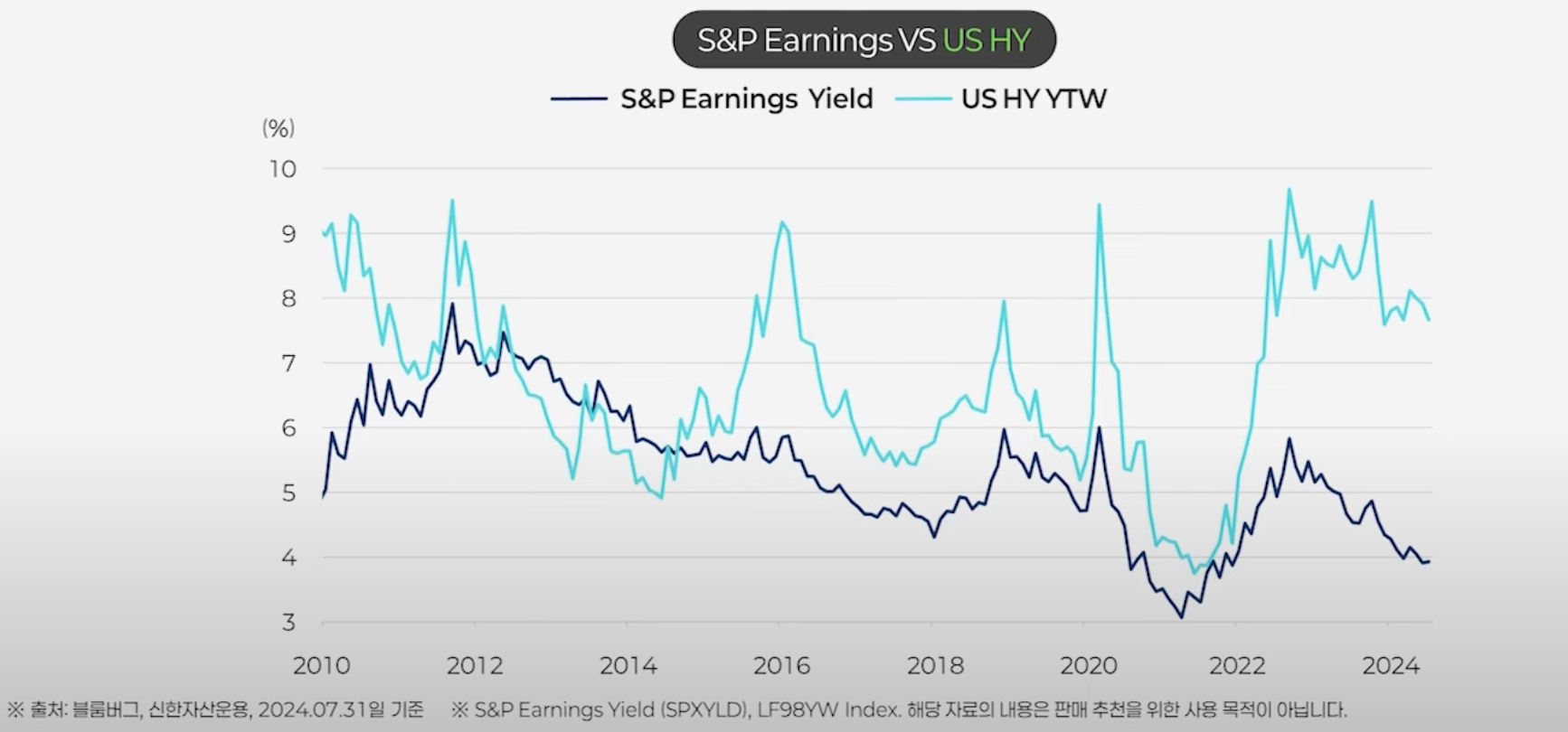 (그래프에서 US HY YTW란, US High Yield Yield-to-Worst, 즉 발행자가 부도나지 않는다는 전제 하에 하이일드 투자자가 얻을 수 있는 가장 낮은 연환산 수익률을 의미합니다.)