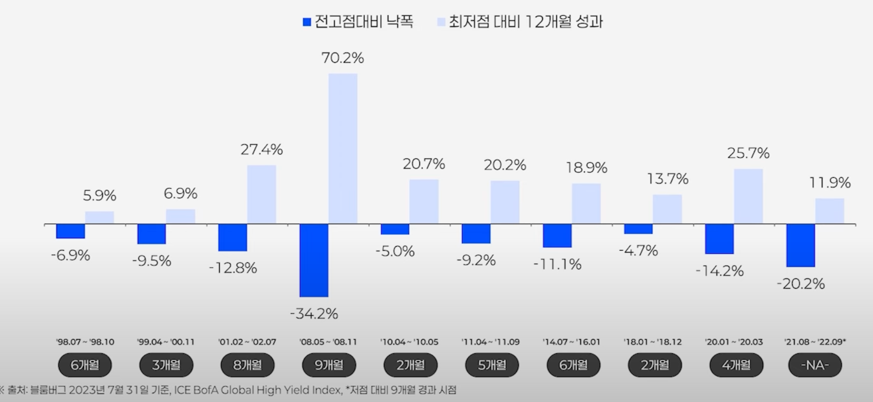 우리 주인장님도 전에 말씀하신 적이 있지만, 하워드 막스 역시 S&P500을 투자하면서 기대하는 연 수익률이 앞으로 하향할 수 있음을 지적합니다. 반면 하이일드 채권은 꽤 지속해서 연 평균 6~9% 범위의 수익률을 계약적으로 제공합니다. 이 가정이 맞다면 하이일드 채권은 불확실성의 측면에서 분석을 해보아도 충분히 엣지를 가져다줄 수 있는 자산입니다.
