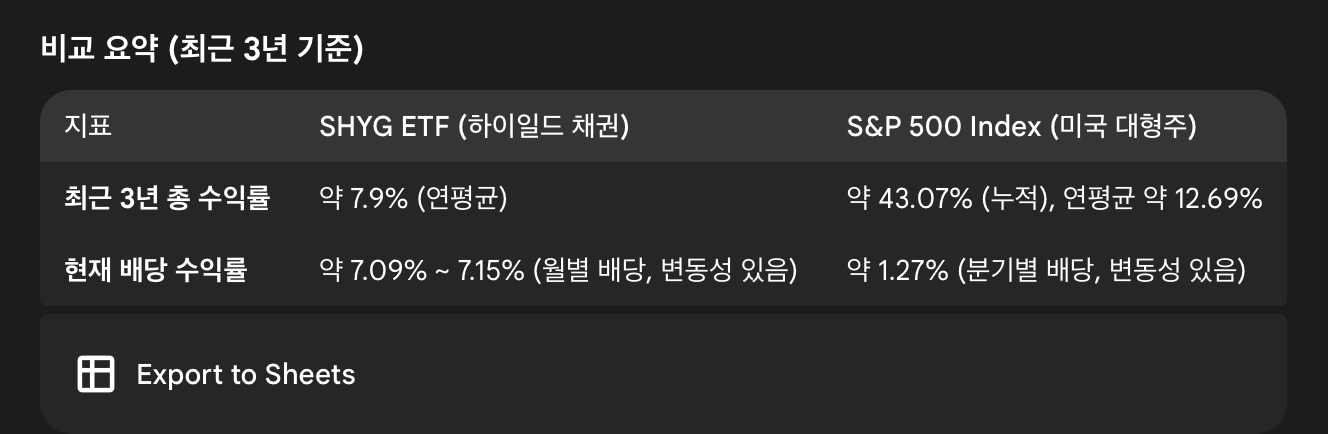 저 중 한가지만 잠시 찾아보자면 SHYG의 경우, 최근 3년의 수익률을 S&P500과 비교하면 아래와 같습니다. 배당이 포함된 결과입니다.