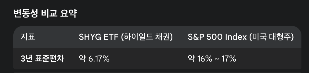 쉽게 하는 오해 중 하나가 '하이일드는 투자 부적격 채권들이니까 너무 위험한거 아냐? 파산나면 어떡해?' 라는 생각일텐데요, 사실 우리가 쉽게 투자하는 S&P500 지수에 비해 SHYG ETF의 변동성은 2배 이상 낮습니다. 즉, 포트폴리오의 변동성을 줄이고 싶을 때 아주 유용하게 쓰일 수 있는 투자 방식이 될 수 있습니다. 물론 대규모 파산이 일어나는 일은 따로 모니터링을 해야합니다.