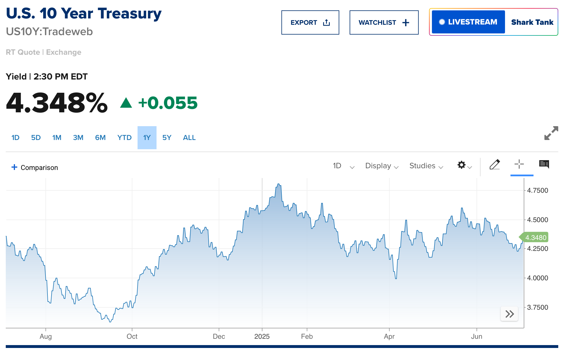 • 현재 제가 확인한 10년물 국채 금리는 4.35%이고, 그래프는 아래와 같습니다. 그 동안 앵커의 범위 내에서 계속 머물렀던 것으로 보입니다.