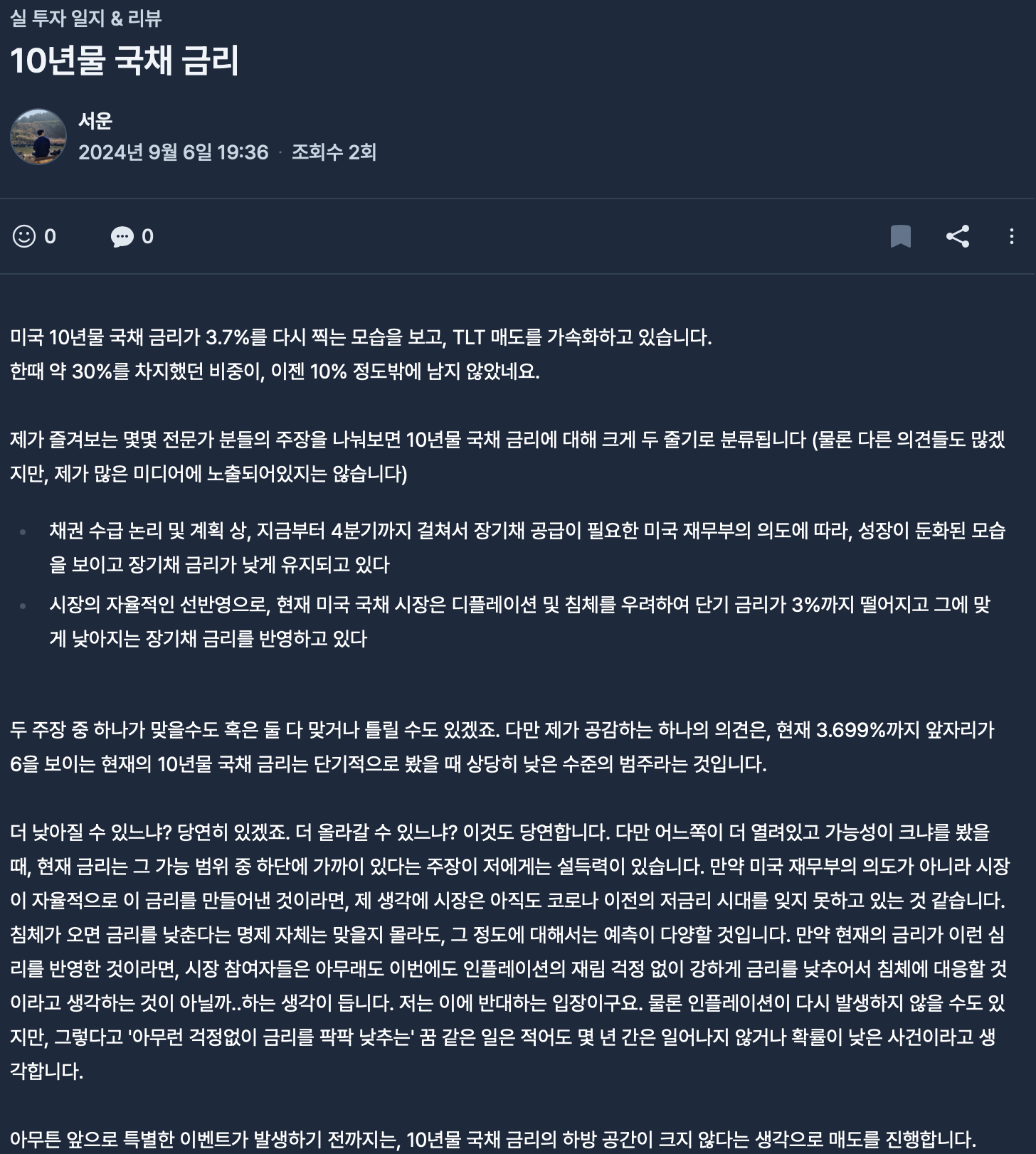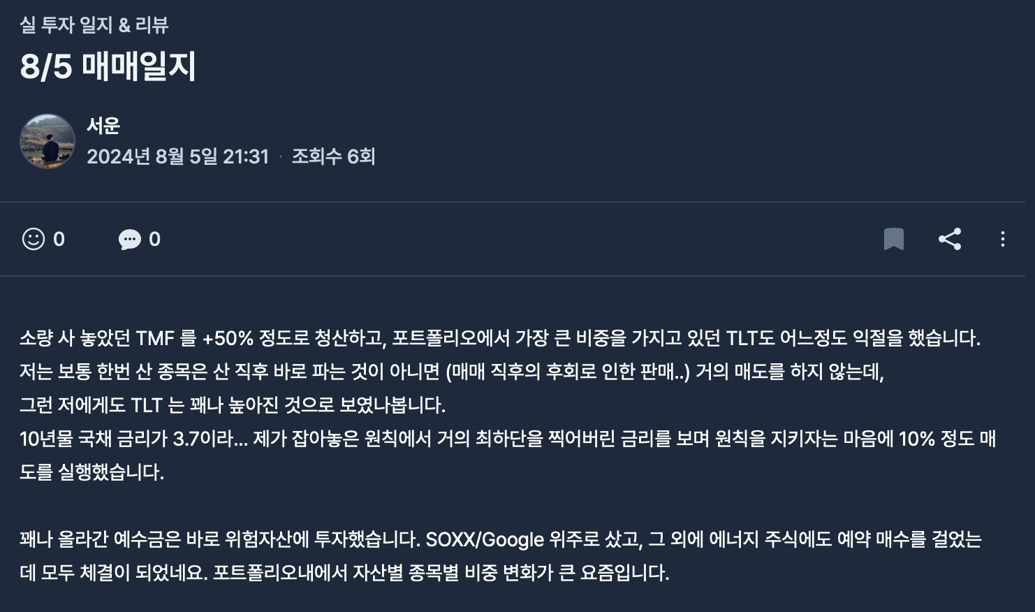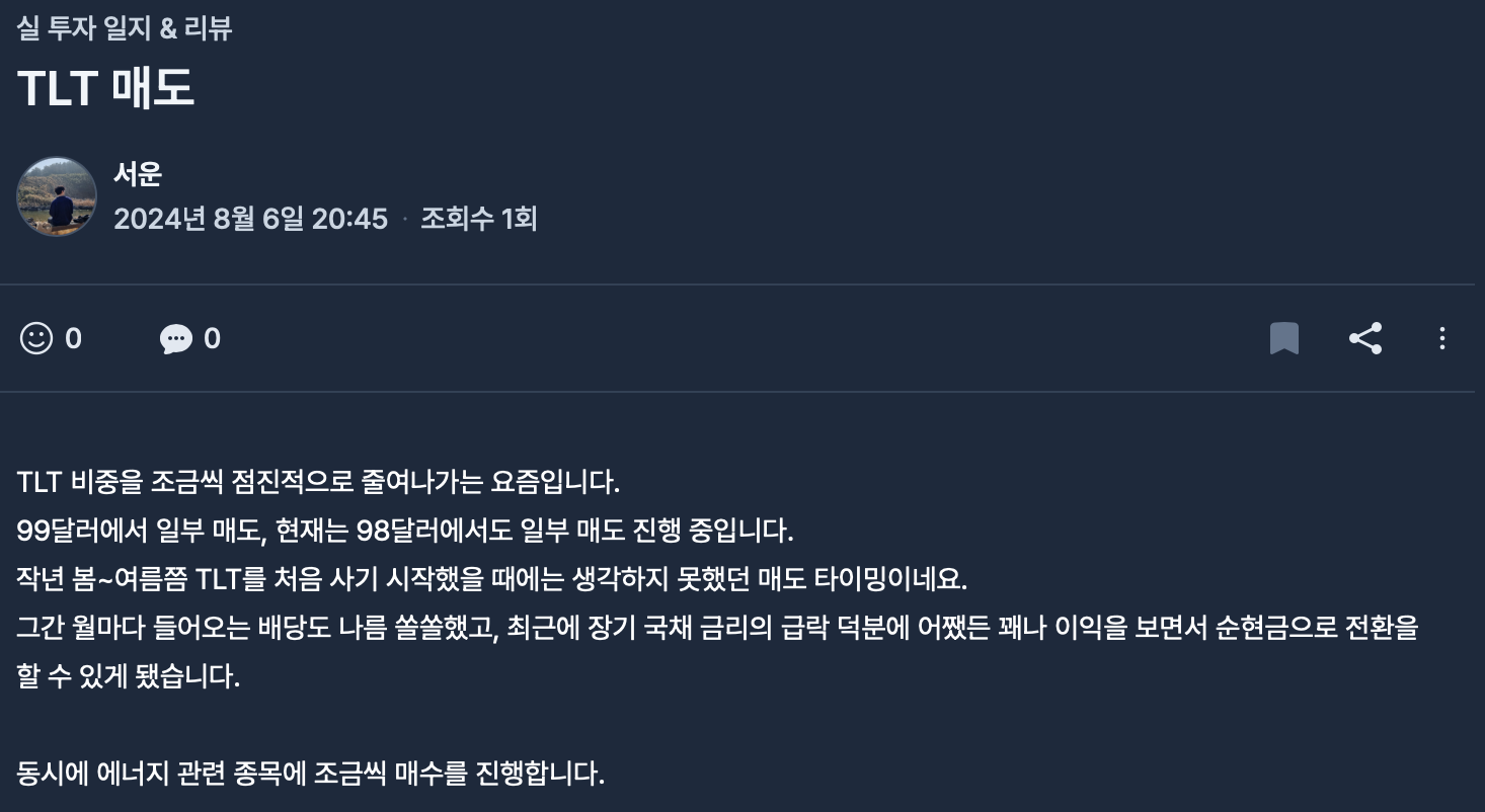 23년 중순부터 꾸준히 매입 및 보유하던 TLT ETF를 24년 8~9월에 걸쳐서 전액 매도했고, 이에 대한 매매 일지를 세 편 작성했습니다.