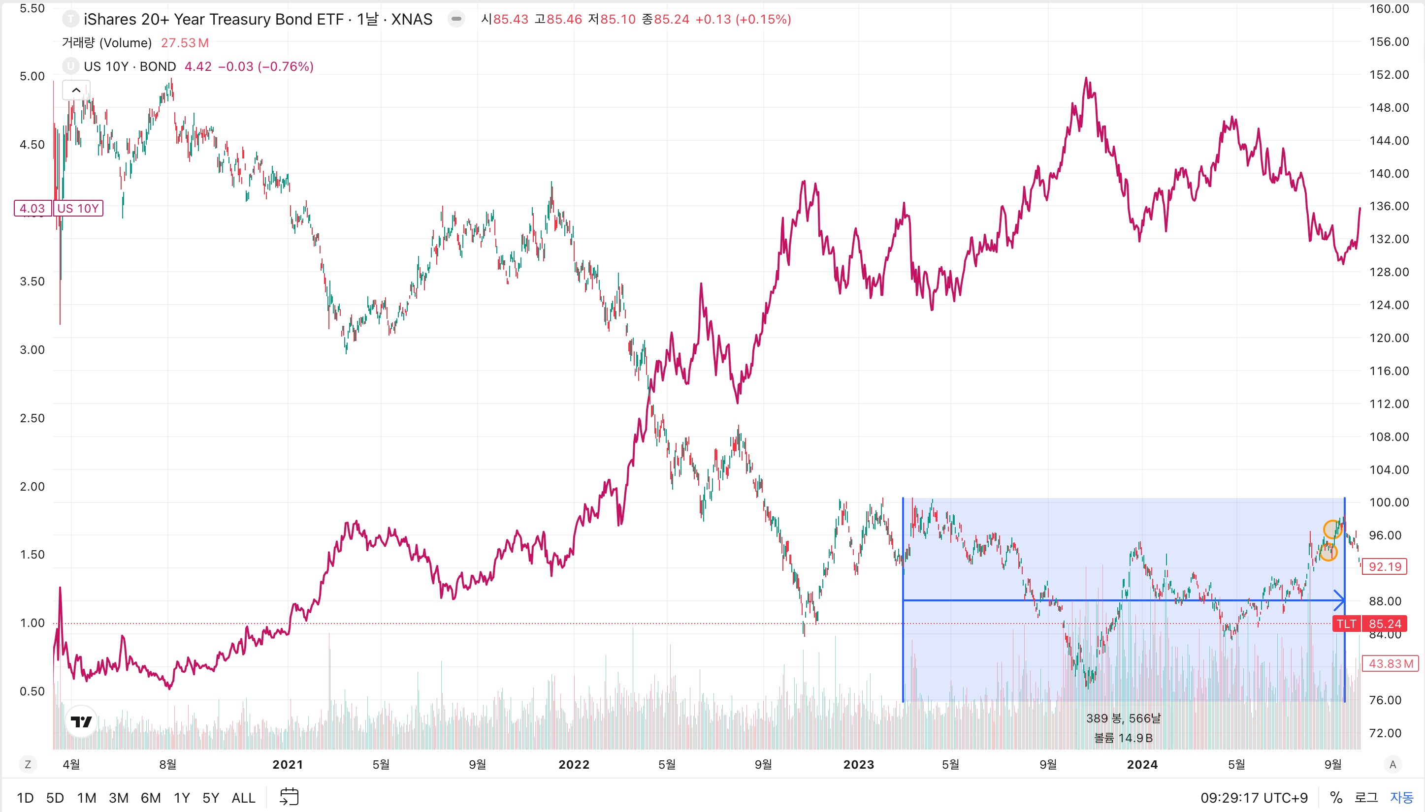 당시 TLT 의 차트와 10년물 국채 금리의 차트는 아래와 같습니다. (매도 지점을 주황색 원으로 표시했습니다)