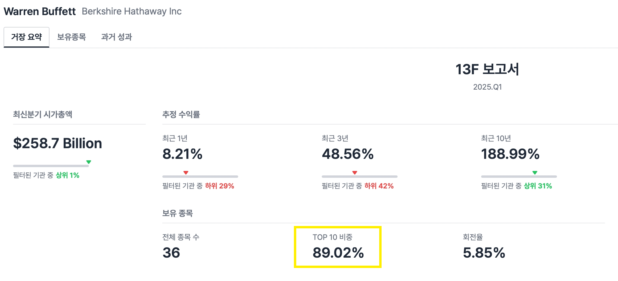사람들은 '워렌 버핏은 집중 투자를 설파하더니 본인은 투자한 종목이 몇십 개던데?' 라는 말을 종종 하지만, 사실 그 선생님은 상위 6개 종목에 (현금 제외) 포트의 약 73%를 투자하고 있습니다. 그러니 그분은 집중 투자형이라고 생각합니다.