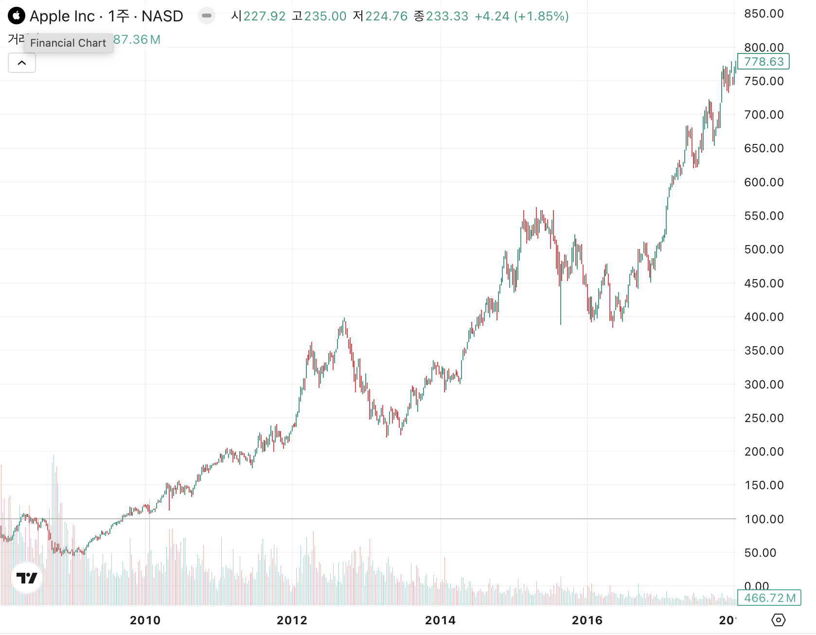 모바일 산업이 떠오르기 시작했고, 애플은 07년 아이폰 출시 이후 점점 성장하며 산업을 이끄는 포지션으로서 기업의 존재감을 올렸기 때문에 2008년부터의 10년 경로를 선택했습니다.
