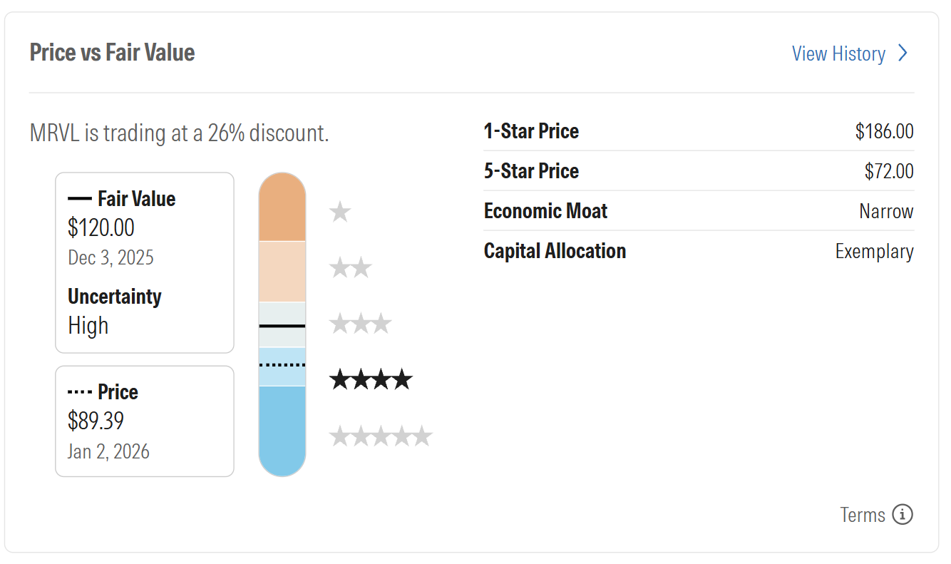 제가 구독 중인 Morningstar는 '적정 가치', 즉 Fair value라는 용어를 사용하며 아래와 같은 그래픽을 제공합니다. 그리고 현재 가격이 얼마나 저평가(혹은 고평가)인지를 표시하기 위해 [1-star price] ~ [5-star price] 로 범위를 제시합니다. 예시에서 MRVL 은 4-star price로 현재 가격이 매력적인 구간에 있네요. (요즘 제 관심 기업입니다)