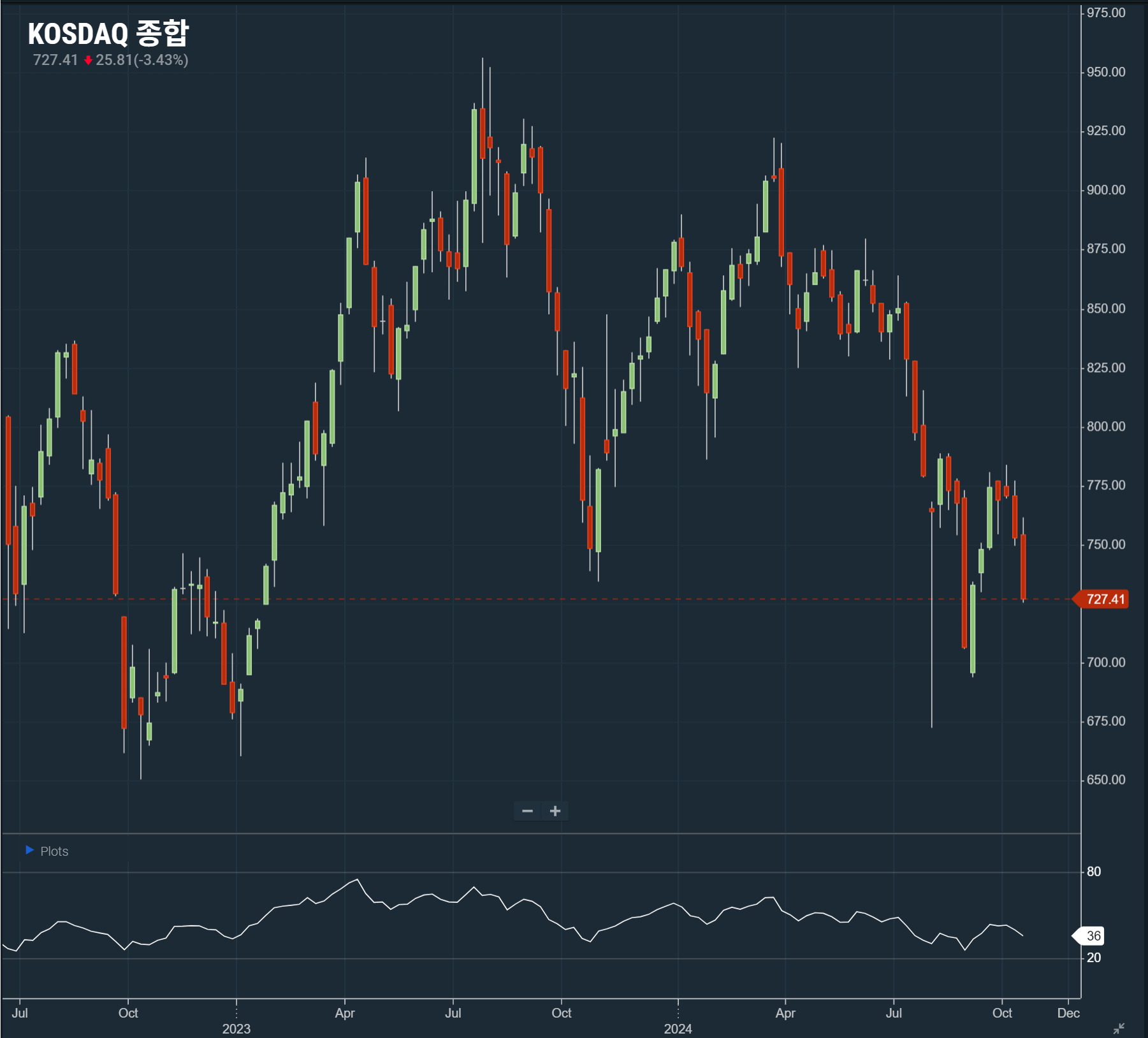 이번주 코스닥 무지막지하게 하락. 뭘 선을 긋기도 애매한 지수