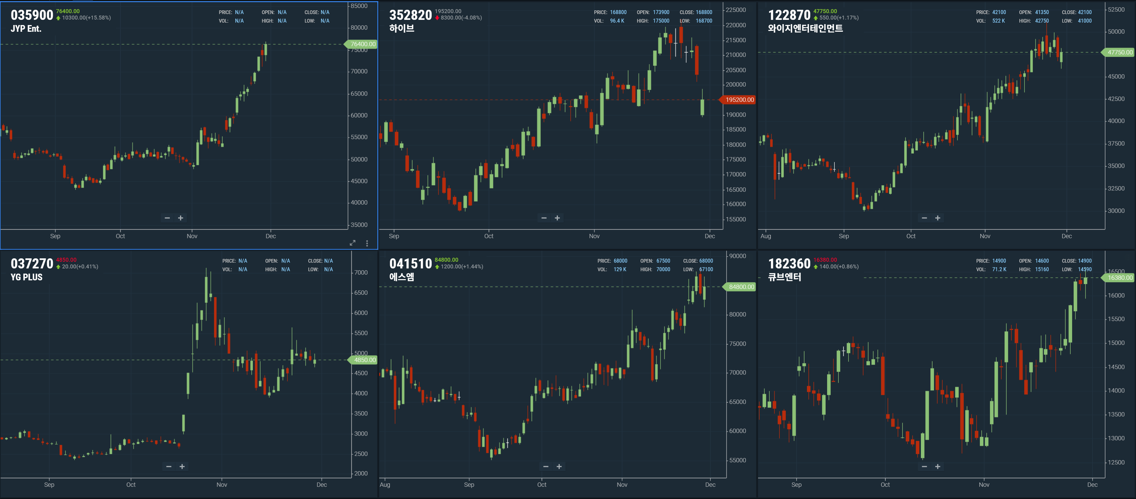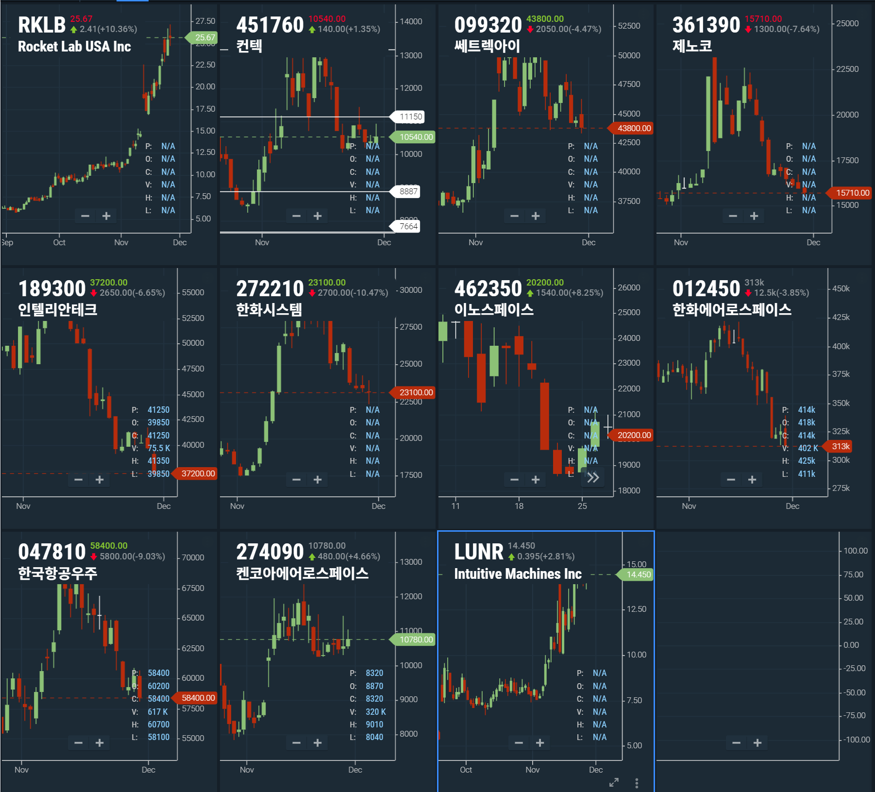 국내 우주 기업 중에선 눈에 띄는 종목은 없다. 머스크와 트럼프의 관계, 우주 발사 규제를 푼다는 등 몇가지 소식으로 아주 하늘 높이를 넘어 진짜 우주까지 주가 발사 중.