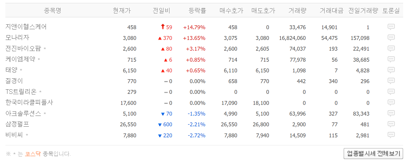 이와주엥 오른 친구들을 보니 가정용품의 지앤이헬스케어와 모나리자. 검색해보니 여성용품 관련 회사이다. 이외에 깨끗한나라, 깨끗한나라우가 거의 상한가를 갔네..... 사람들 진짜 빠르다